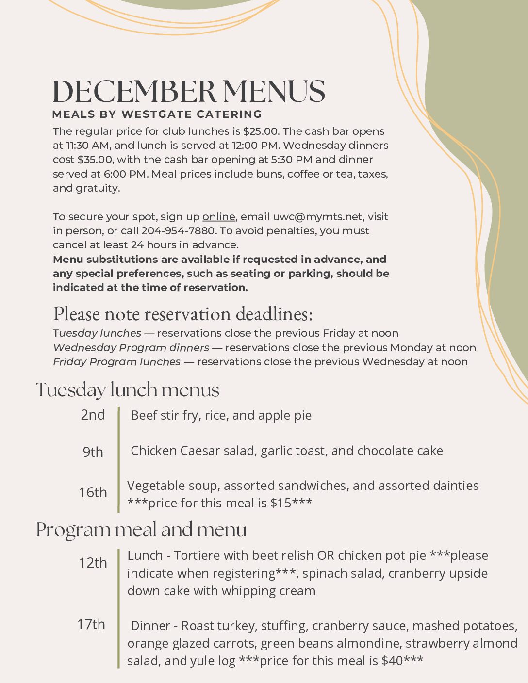 Dining at the club is available Tuesdays and on special occasions by reservation through the UWC office or by calling 204-954-7880.
