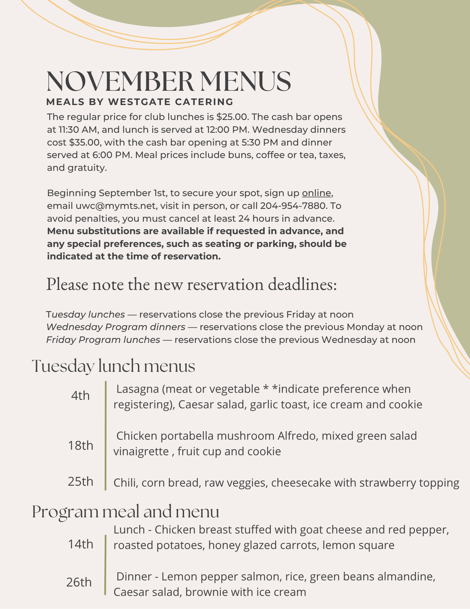 Dining at the club is available Tuesdays and on special occasions by reservation through the UWC office or by calling 204-954-7880.